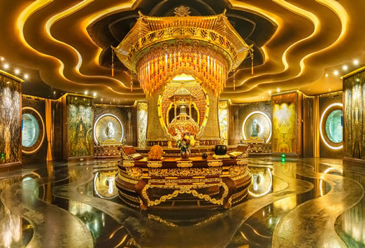 舍利藏宮又稱佛寶層,整體以暗色調為主,營造出莊重的氛圍。由三廳一廊、藏宮大殿(舍利寶幢、拼畫、四大菩薩)、參拜環(huán)廊三部分組成。這里既是珍藏佛祖頂骨舍利的神圣之地,又是信眾禮佛參拜、靜坐禪修的神秘空間。長廊長66米,根據六波羅密的供養(yǎng)內涵,即持戒、布施、忍辱、精進、禪定、智慧布局,分別是香供廳、燈供廳、水供廳以及花供長廊。