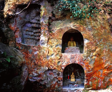 明代摩崖石刻,位于牛首山東峰兜率巖北崖,距弘覺寺塔約一百米。崖壁上共開鑿5個佛龕,北壁3個,東壁2個,共有133尊雕像。石刻整體呈“幾”字形,三面巖石南北長11.5米,東西寬5.8一8米,中間圍合成約77平方米的平地空間,正窟面對祖堂山主峰獻花巖。石刻包括佛像、題刻。5座佛龕內每座佛龕所雕數目不等。在石壁正中一龕里,僅雕釋迦牟尼像,高1.78米,結跏趺壘,施禪定印,下為高0.39米仰覆蓮須彌座,雕刻較為粗糙。在龕外左右兩壁上刻有記載牛首山“敕賜弘覺禪寺”所屬范圍的文字。距該龕東西兩側約3米處各有一龕,東龕上下九層共75尊,最下層為環(huán)立武僧。上面皆為盤膝打坐的修士,但絕大多數已有損毀。西龕則雕鑿在“幾”字形的側壁上,其內容、風格與東龕相同。在西龕的下部相距高約0.39米處,另有一小龕,內鑿高0.45米的彌勒像一尊,藝術造詣較高于其他諸像,且龕外石壁右側刻有“大明成化元年歲次乙酉五月五日口口真定成造彌勒佛一尊永遠供養(yǎng)”的題記。佛龕兩側尚刻有四處梵文,其東壁南側的巖石上,鐫一行梵文,寬約1.6米,另有《題感應泉詩》一首,詩系刻在石壁上,長0.5米,寬0.32米,每字約4厘米,有11行,滿行8字,共83字,除去4字已剝蝕外,其余79字清晰可辨。