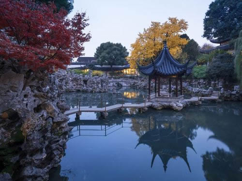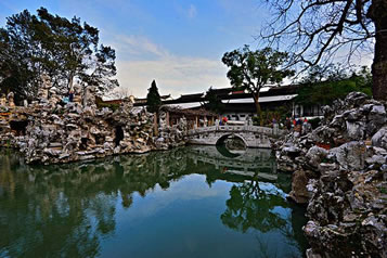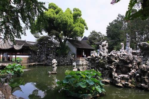 園內(nèi)水體聚中有分。聚合型的主體水池中心有亭佇立,曲橋連亭。在園西假山深處,山石做懸崖?tīng)。一股清泉?jīng)湖石三疊,奔瀉而下,形成了蘇州古典園林引人注目的人造瀑布。園中水景豐富,溪澗泉流,迂回于洞壑峰巒之間,隱約于林木之中,藏尾于山石洞穴。