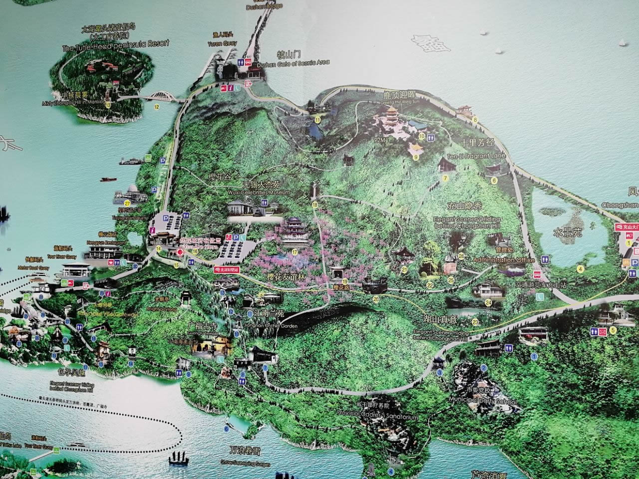 黿頭渚風(fēng)景區(qū)有充山隱秀、鹿頂迎暉、黿渚春濤、橫云山莊、萬(wàn)浪卷雪、湖山真意、十里芳徑、太湖仙島、江南蘭苑、櫻花谷、無(wú)錫人杰苑及中犢晨霧、廣福古寺等10多處景點(diǎn)。其中有自然山水畫卷;有山鄉(xiāng)田園風(fēng)光;有江南園林景致;還有吃、住、購(gòu)、行等配套齊全的服務(wù)和娛樂(lè)設(shè)施,加上歷代名人雅士游蹤、石刻、書畫、傳說(shuō)等諸多內(nèi)涵深厚的文化積淀,構(gòu)成了此地以天然山水為主、人工點(diǎn)綴為輔的綜合性、多功能風(fēng)景旅游勝地。