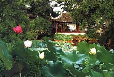 ( 4)園林景觀,花木為勝。拙政園向以“林木絕勝”著稱。數(shù)百年來一脈相承,沿襲不衰。早期王氏拙政園三十一景中,三分之二景觀取自植物題材,如桃花片,“夾岸植桃,花時望若紅霞”;竹澗,“夾澗美竹千挺”,“境特幽回”;瑤圃百本,花時燦若瑤華。”歸田園居也是叢桂參差,垂柳拂地,“林木茂密,石蘚然”。每至春日,山茶如火,玉蘭如雪。杏花盛開,“遮映落霞迷澗壑”。夏日之荷。秋日之木芙蓉,如錦帳重疊。冬日老梅偃仰屈曲,獨(dú)傲冰霜。有泛紅軒、至梅亭、竹香廊、竹郵、紫藤塢、奪花漳澗等景觀。至今,拙政園仍然保持了以植物景觀取勝的傳統(tǒng),荷花、山茶、杜鵑為著名的三大特色花卉。僅中部二十三處景觀,百分之八十是以植物為主景的景觀。如遠(yuǎn)香堂、荷風(fēng)四面亭的荷(“香遠(yuǎn)益清”,“荷風(fēng)來四面”);倚玉軒、玲瓏館的竹(“倚楹碧玉萬竿長”,“月光穿竹翠玲瓏”);待霜亭的桔(“洞庭須待滿林霜”);聽雨軒的竹、荷、芭蕉(“聽雨入秋竹”,“蕉葉半黃荷葉碧,兩家秋雨一家聲”);玉蘭堂的玉蘭(“此生當(dāng)如玉蘭潔”);雪香云蔚亭的梅(“遙知不是雪,為有暗香來”);聽松風(fēng)處的松(“風(fēng)入寒松聲自古”),以及海棠春塢的海棠,柳陰路曲的柳,批把園、嘉實(shí)亭的批把,得真亭的松、竹、柏等等。