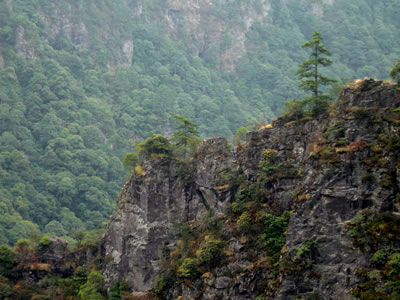 杜鵑山距茨坪西南面三十五公里,海拔1357米。主要由中峰 (揚(yáng)眉峰)、西峰(望指峰)、東峰(觀島峰)三大峰組成。遠(yuǎn)望猶如古代的筆架,故名筆架山。