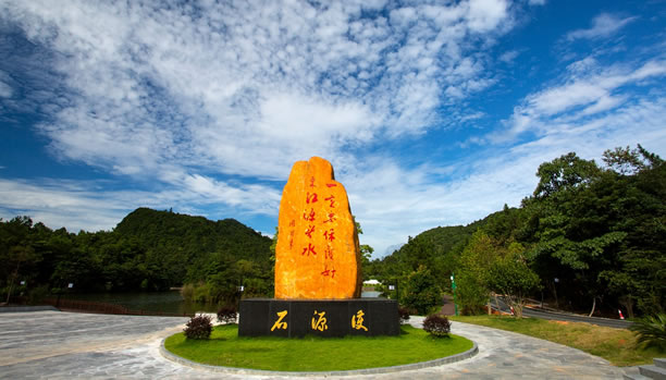 護源石是2017年紀念香港回歸20周年時所立,石碑上“一定要保護好東江源頭水”為周恩來總理的親筆題詞。1963年,香港遭遇了60多年來最嚴重的一次干旱,350萬人的生活因缺水陷入困境。當年12月,周恩來總理親自批示,撥?钣昧11個月的時間在深圳建成了東深供水工程,把東江的水引到香港,從此結束了香港長期缺水的歷史。護源石形狀像一只手掌,寓意用手護源,石頭高5.23米,與東江流域長度523公里相對應,寬3米,代表贛、粵、港三地;護源石底座長4.65米,與三百山到香港的距離465公里相對應;花壇采用圓形,寓意“圓圓滿滿”。