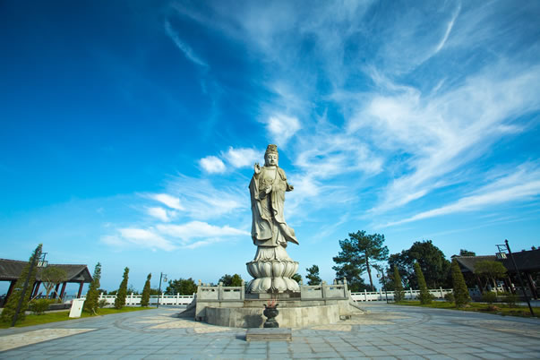 滴水觀音菩薩雕像于2007年香港回歸10周年贛粵港信眾捐建,其寶相慈祥莊嚴,左手持凈瓶,右手做法印,屹立在三百山東江的源頭。雕像總高11.69米,與主峰海拔相稱。雕像的形態(tài)、手法符合佛教的意義,具備當今美學、建筑學、雕塑學、佛像藝術的時代特色。