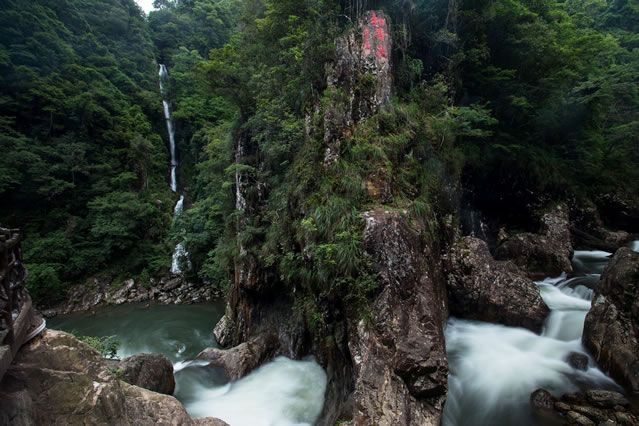 東江第一瀑由福鰲塘和山上大小溪流匯集而成,瀑布單級落差120多米,是目前景區(qū)發(fā)現單級落差最大的常流瀑布,氣勢雄偉,兩側峭壁凌空,古木參天。飛瀑前方視野開闊,遠處青山疊翠,林海蒼茫,令人心曠神怡。石壁上東江源三個字是由全國政協(xié)原副主席葉選平題寫。