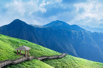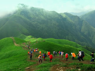 武功山的高山草甸海拔之高,面積之廣在世界同緯度名山中都是絕無僅有的。10萬畝草甸綿綿于海拔1600多米的高山之巔,穿云入霧,春夏綠油油,秋季金燦燦,冬天白皚皚,游人無需遠赴邊陲,便可領略北國風光,真可謂“天上草原、人間仙境、北國風光、綠色家園”,被專家稱為“奇山伴草甸,天下一絕”。