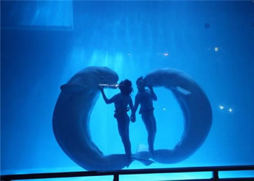 表演地點(diǎn):白鯨水下表演場(chǎng)(開(kāi)放式表演場(chǎng),無(wú)表演時(shí)游客可透過(guò)玻璃展窗看白鯨游動(dòng))。