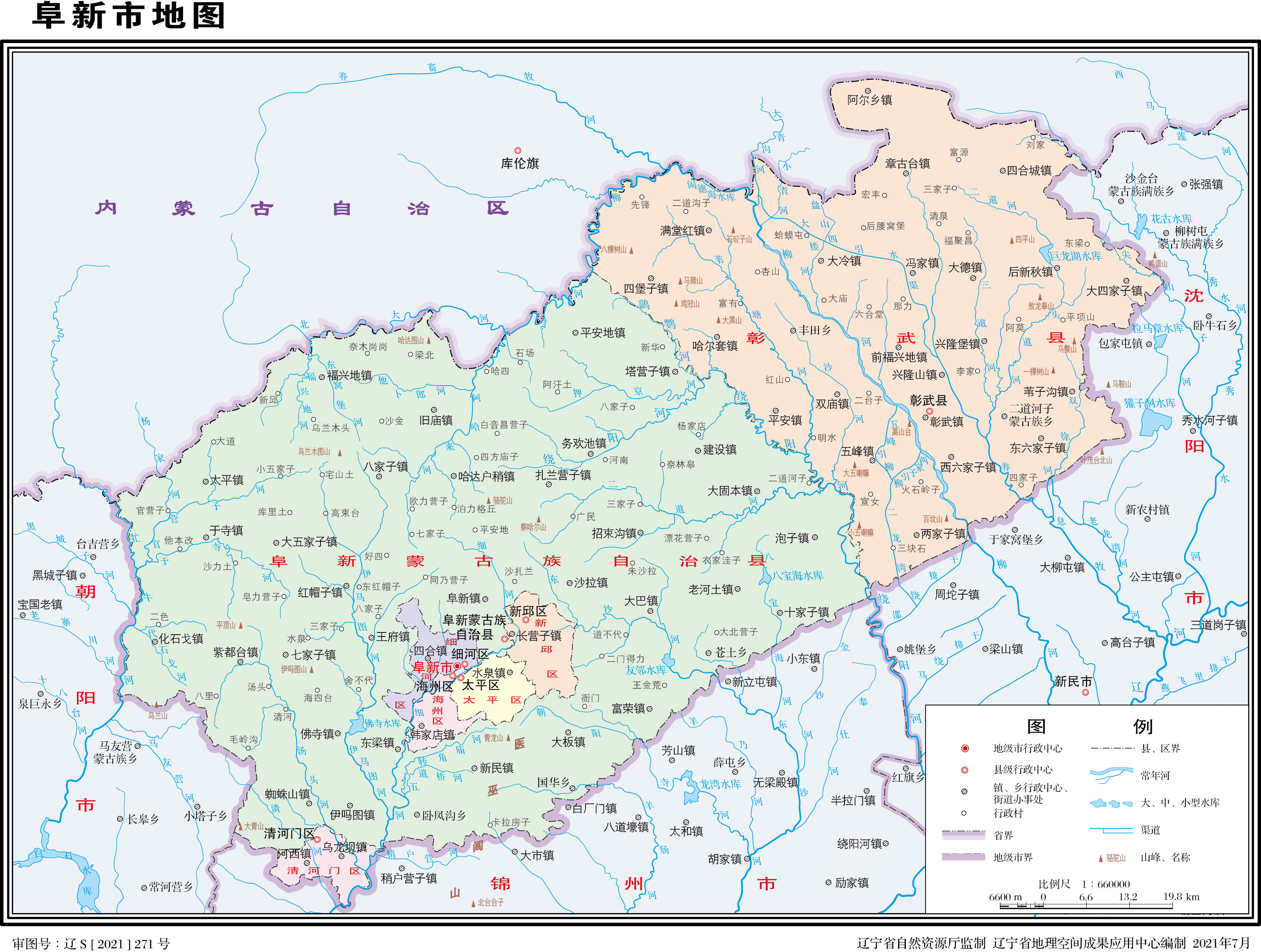 民國初年,仍延續(xù)清末建置。民國二十二年(1933年),日本侵略者侵占阜新后,日偽當(dāng)局于民國二十九年(1940年)1月1日,由阜新縣境劃出新邱、長營子、米家窯、海州、孫家灣和今阜新鎮(zhèn)等地置阜新市。同時,實(shí)行廢縣存旗體制,撤銷阜新縣。