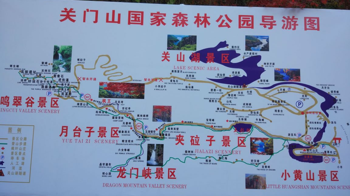 森林公園內(nèi)有四大景區(qū)小黃山景區(qū)、夾砬子景區(qū)、龍門峽景區(qū)和月臺(tái)子景區(qū),共計(jì)108處景點(diǎn)。它有三道門:北門,在小市方向,雙峰對(duì)峙,中間拱橋相連;南門,在去湯溝的嶺頂,公路從中穿過(guò),十分險(xiǎn)要;中門,在深谷河道中,“雙扉”夾水,寬只二十余米,為興修水庫(kù)的天然門柱,有人把關(guān)門山風(fēng)景譽(yù)為“小江南”,“賽黃山”,說(shuō)它有五美:山美,陡峭,俊秀,似一簇簇盆景;樹美,樹木種類繁多,特別是秋天的楓葉,冬季植根于峭壁上的蒼松,非常壯觀;水美,湯河穿過(guò)山谷,匯集小溪,飛瀑,“奪門”而出,似來(lái)自于天際;花美,天女木蘭,山杜鵑,漫山遍野;云美麗,清晨雨后,山谷中云霧繚繞,如披輕紗,分外嫵媚。歷代文人多有詩(shī)篇贊頌,許多美術(shù)工作者,經(jīng)常到這里寫生、作畫。