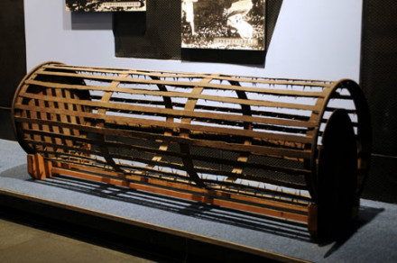 滾地籠刑具:這件黑色的鐵制滾地籠刑具,就是日偽時期被用于迫害抗日反滿志士及廣大無辜群眾的刑具。它縱66厘米,橫200厘米,呈圓柱形,中空,籠內(nèi)壁鑲滿鋒利的釘刺,釘尖向內(nèi),側(cè)面為鐵皮蓋,可打開。 該刑具原存于沈陽階級教育展覽館,后由遼寧近現(xiàn)代歷史博物館收藏,1998年,調(diào)撥給“九·一八”事變紀(jì)念館擴建辦,1999年9月18日轉(zhuǎn)入“九·一八”歷史博物館收藏。