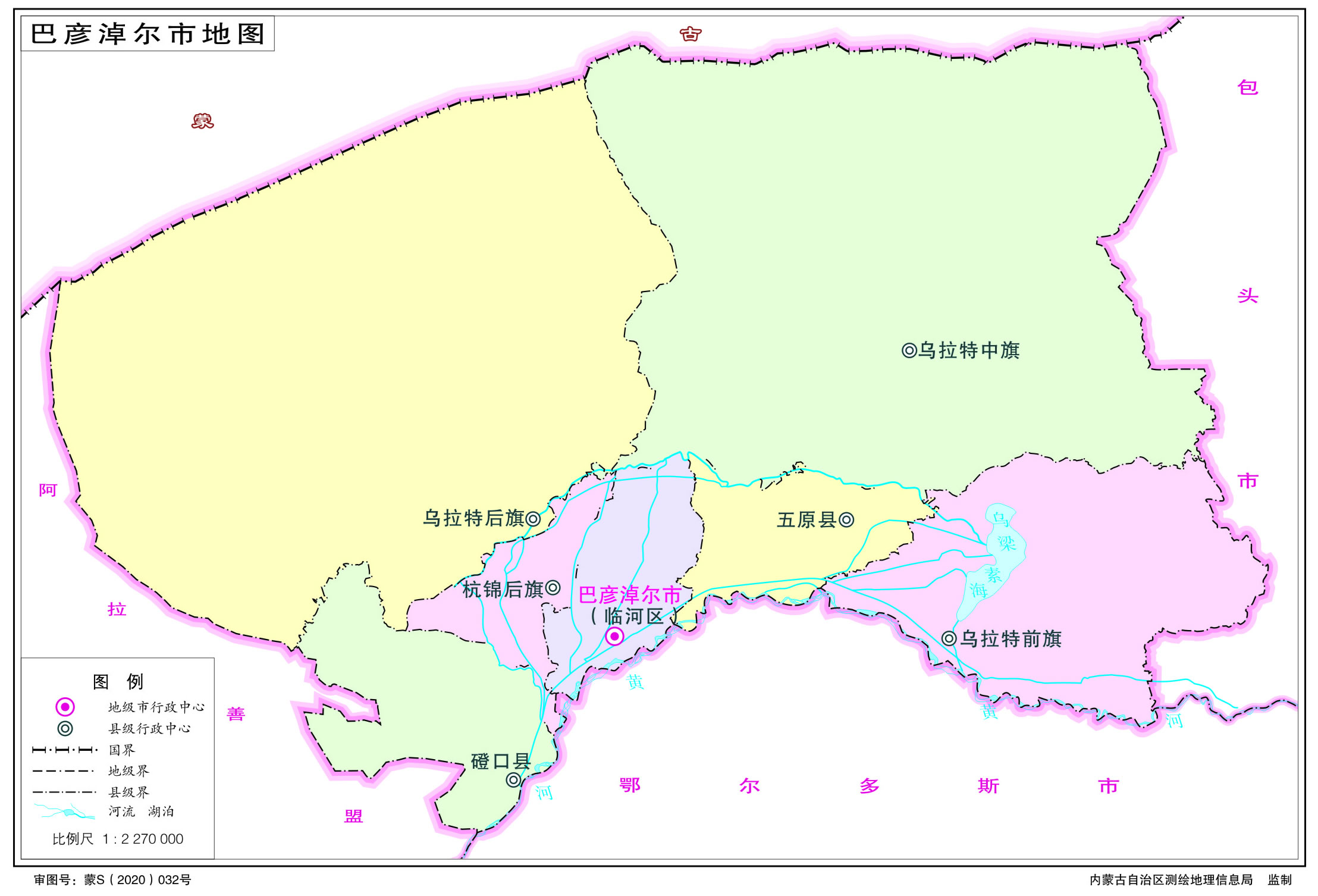 巴彥淖爾市轄1個(gè)市轄區(qū)、2個(gè)縣、4個(gè)旗: