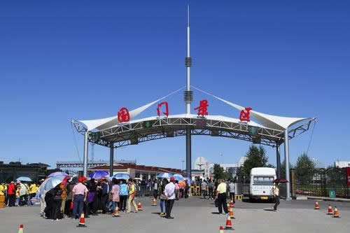 國(guó)門莊嚴(yán)肅穆,在國(guó)門乳白色的門體上方嵌著“中華人民共和國(guó)”七個(gè)鮮紅大字,上懸掛國(guó)徽,國(guó)際鐵路從下面通過(guò)。