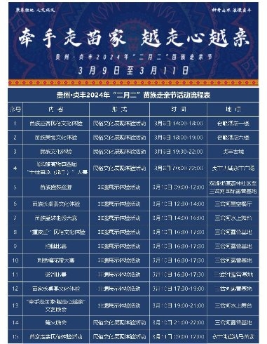 2024年3月9日至11日,貴州貞豐將迎來(lái)盛大的“二月二”苗族走親節(jié)活動(dòng)。本次活動(dòng)由貞豐縣苗學(xué)會(huì)主辦,貞豐縣雙峰文旅集團(tuán)協(xié)辦。