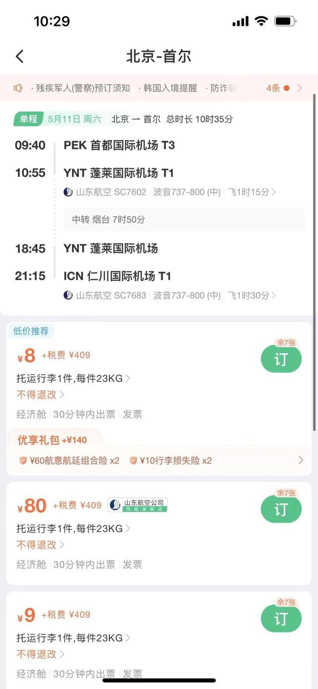 國(guó)際機(jī)票方面,中新經(jīng)緯查詢發(fā)現(xiàn),5月11日北京飛往首爾的機(jī)票(不含稅)價(jià)格低至8元,但另需409元稅費(fèi)。具體來看,該航班5月11日早9點(diǎn)40分從北京首都機(jī)場(chǎng)起飛,經(jīng)煙臺(tái)蓬萊國(guó)際機(jī)場(chǎng)轉(zhuǎn)機(jī),于當(dāng)天晚上9點(diǎn)15分落地仁川國(guó)際機(jī)場(chǎng)。