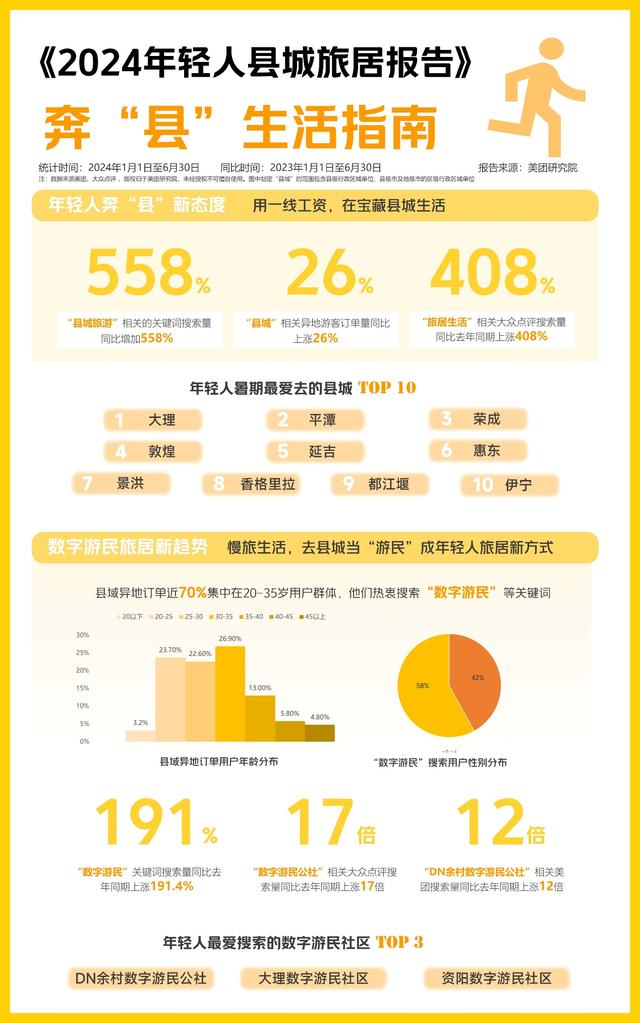 美團近期發(fā)布的《2024年輕人縣城旅居報告》(下稱《報告》)顯示,今年暑期,大理、平潭、榮成、敦煌、延吉為年輕人最愛去的縣城。這些年輕人熱衷搜索“數(shù)字游民”“旅居”等關(guān)鍵詞,“數(shù)字游民公社”大眾點評搜索量同比去年同期上漲17倍。