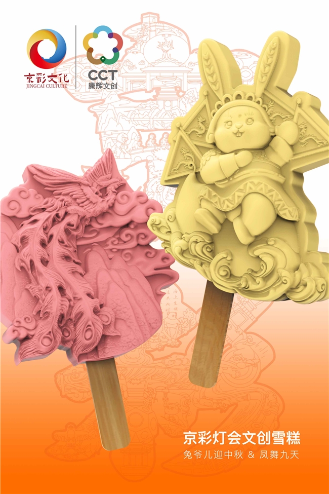 燈會文創(chuàng)雪糕:造型1兔爺迎中秋——體現北京特色的非遺兔爺,配合京劇裝扮;造型2選自“鳳舞九天”燈組。