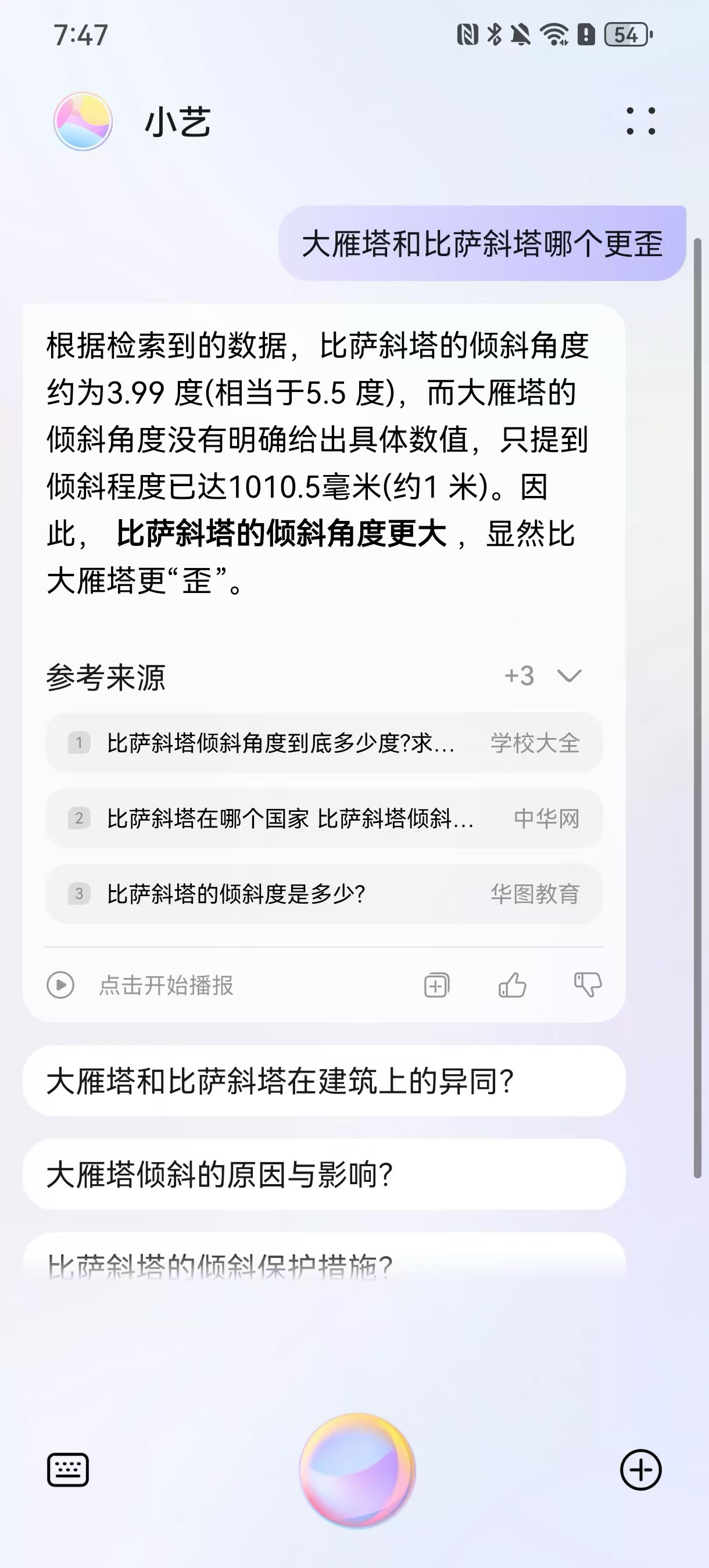 確定好目的地之后,到底怎么玩?對大多數(shù)人來說,既要規(guī)劃詳細(xì)、又要細(xì)節(jié)不出紕漏的“完美旅行攻略”非常費(fèi)時(shí)費(fèi)力。而小藝可以從特色景點(diǎn)、住宿、餐飲、注意事項(xiàng)等多個(gè)維度出發(fā),結(jié)合用戶確定的旅行目的地,為你解答各種旅行知識,堪稱旅行界的百科全書。用戶只需長按華為手機(jī)電源鍵或者對手機(jī)說“小藝小藝”即可喚醒小藝,不論是詢問當(dāng)?shù)氐娜宋闹R、歷史典故,還是推薦熱門景點(diǎn)、美食小吃,小藝都能對答如流,幫助大家更快速了解目的地的相關(guān)信息。比如你可以直接問它“為什么景德鎮(zhèn)的瓷器很出名”、大雁塔和比薩斜塔哪個(gè)更歪” “為什么很多人喝不慣北京豆汁兒”,通過各種問題逐漸了解到目的地的各種信息,幫助提升旅行體驗(yàn)。