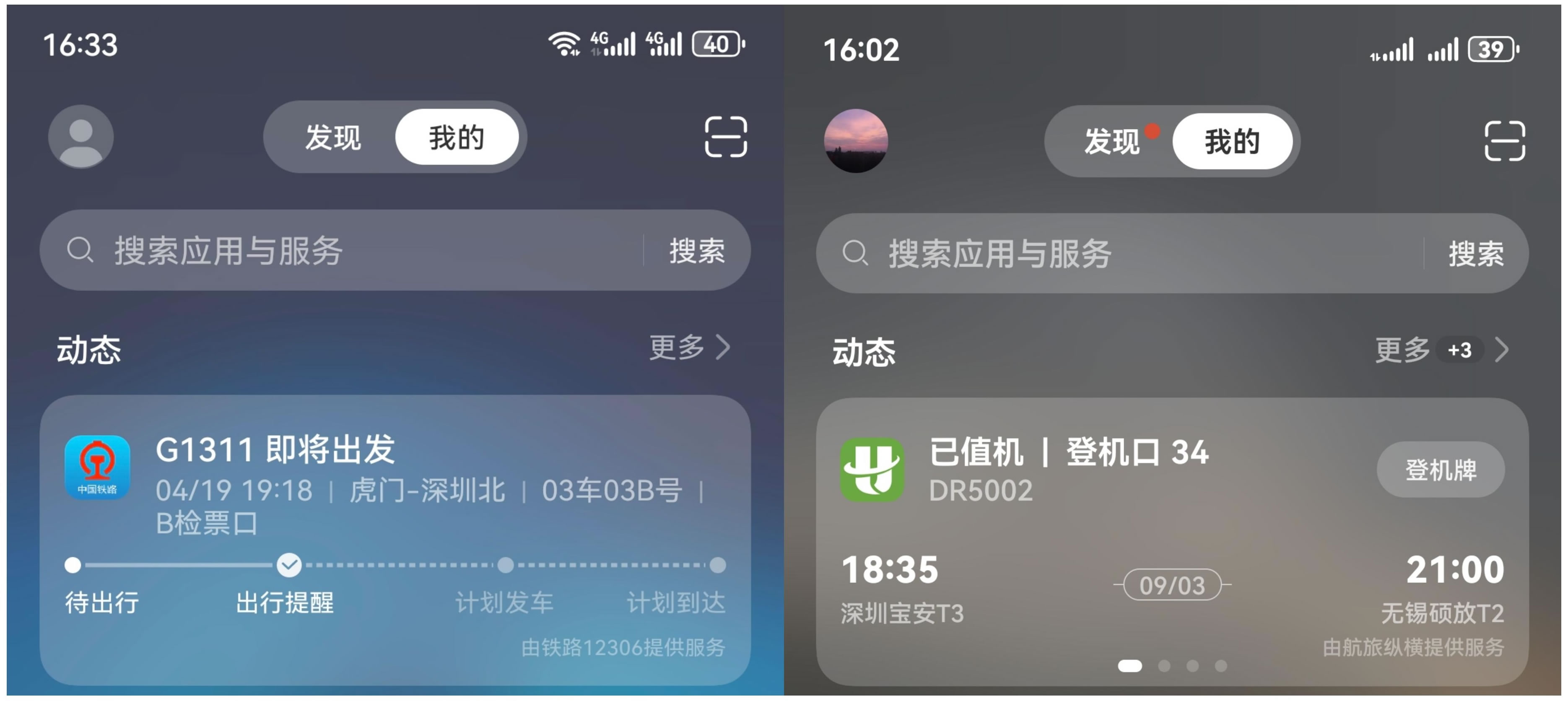 假期出行高峰期,高鐵飛機(jī)可能會(huì)晚點(diǎn)、延誤,出行信息繁多且易忘。華為負(fù)一屏提供的實(shí)時(shí)動(dòng)態(tài)卡片就非常實(shí)用。在負(fù)一屏打開航班、火車服務(wù)通知,綁定賬號后,只需手機(jī)桌面右滑至負(fù)一屏,即可查看12306火車或航旅縱橫航班實(shí)時(shí)動(dòng)態(tài),輔助旅途中行程安排準(zhǔn)確及時(shí)、防止遺忘重要信息。