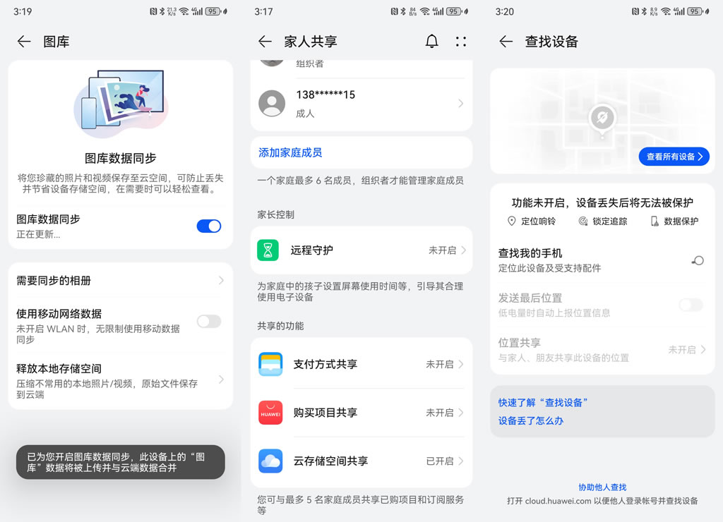 如果實在找不回手機(jī),也不用擔(dān)心旅途中拍攝的照片和視頻會丟失。因為只要開啟了華為云空間的“圖庫數(shù)據(jù)同步”功能,手機(jī)里的照片和視頻就會自動上傳到云端,只要通過華為賬號就能它們找回來。