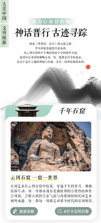 前段時間大熱的《黑神話·悟空》也讓山西古建進入大眾視野,不少游客希望在十一跟隨悟空的步伐,探索打卡這些著名景點。在“神話晉行”板塊可以發(fā)現(xiàn),從云岡石窟的千年佛影到懸空寺的絕壁奇跡,再到應(yīng)縣木塔的巍峨古韻,每一處景點都承載著深厚的歷史文化底蘊和傳奇色彩。專題頁面中這些景點的詳細信息,包括視頻、圖片、筆記、資訊等多媒體內(nèi)容,以及詳盡的旅游攻略,為一場說走就走的神話之旅做好充分準(zhǔn)備。