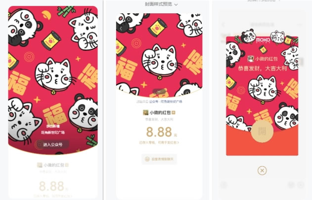 當(dāng)下微信發(fā)紅包搶紅包已成特有的新春社交儀式,據(jù)微信官方數(shù)據(jù)顯示,2024年除夕夜微信用戶共搶到微信紅包50.8億個(gè),發(fā)送拜年紅包1.9 億次,各大品牌也紛紛推出微信紅包封面,為用戶的拜年社交增添喜氣。蛇年新春,MOKO與插畫(huà)家 Cheeky Cheeky 厚面子合作,延續(xù)萌爆漫畫(huà)風(fēng),由厚面子 Cosplay 新年吉祥物招財(cái)貓和頂流大熊貓,在紅包封面上盡顯魅力。新年前分階段陸續(xù)發(fā)放1.5萬(wàn)個(gè)微信紅包封面,為今年的拜年增添滿滿萌趣,拆開(kāi)紅包的親友,不僅能解鎖MOKO超值新春旅客專(zhuān)屬福利,還能再次回味此前深受用戶喜愛(ài)的國(guó)風(fēng)熊貓視頻。