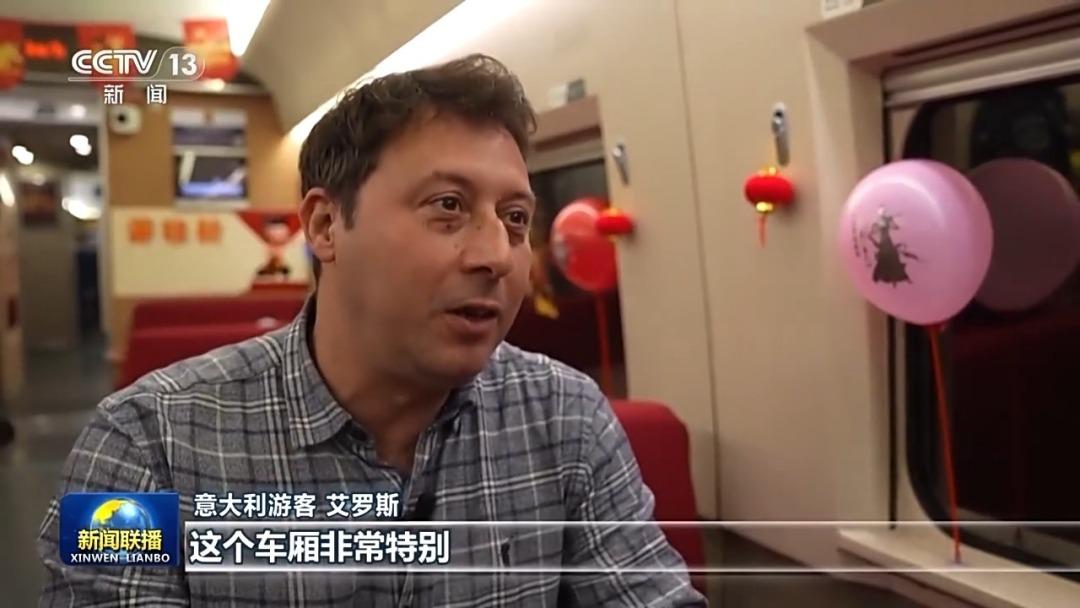 意大利游客 艾羅斯:這個(gè)車廂非常特別,我們知道這段時(shí)間哪吒的話題非常流行,大家都很喜歡這部電影。在體驗(yàn)中國(guó)高鐵速度的同時(shí),這也是一種很好的旅行方式,這非常好。