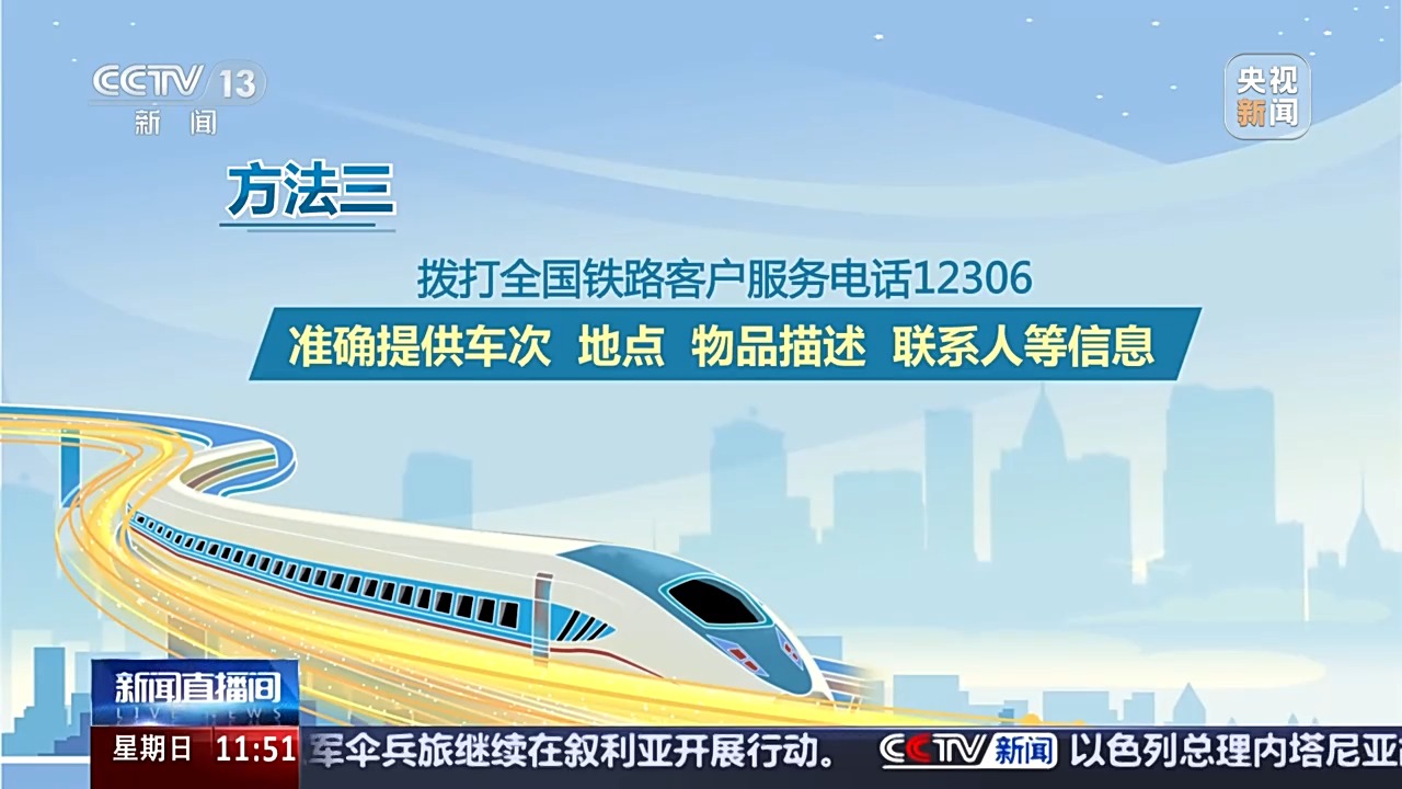 方法三:撥打全國鐵路客戶服務(wù)電話12306,準確提供車次、地點、物品描述、聯(lián)系人等信息,鐵路部門將全力幫您查找。
