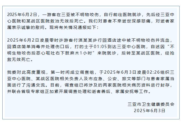 據(jù)“三亞市衛(wèi)生健康委”微信公眾號消息,6月2日,一游客在三亞被不明物咬傷,自行前往醫(yī)院就診,先后經(jīng)三亞中心醫(yī)院和某戰(zhàn)區(qū)醫(yī)院救治無效后死亡。三亞市衛(wèi)生健康委將有關(guān)情況通報如下: