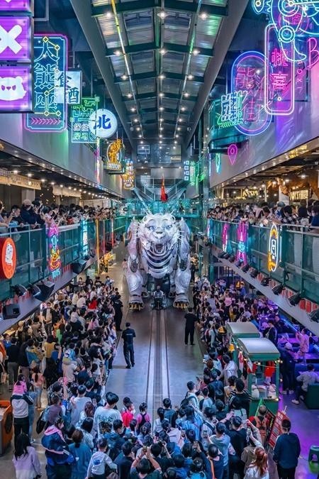 熊洞街是一個由4800平方米廢棄工業(yè)廠房改造的沉浸式IP樂園,樂園里有巨獸巡游、時尚文創(chuàng)、科技研學(xué)、特色美食等元素,用文化、科技、藝術(shù)結(jié)合的方式,打造了一個“尖叫地標(biāo)”,并通過“巨熊北北”這個超級IP,把文旅和商業(yè)業(yè)態(tài)有機(jī)融合在一起。