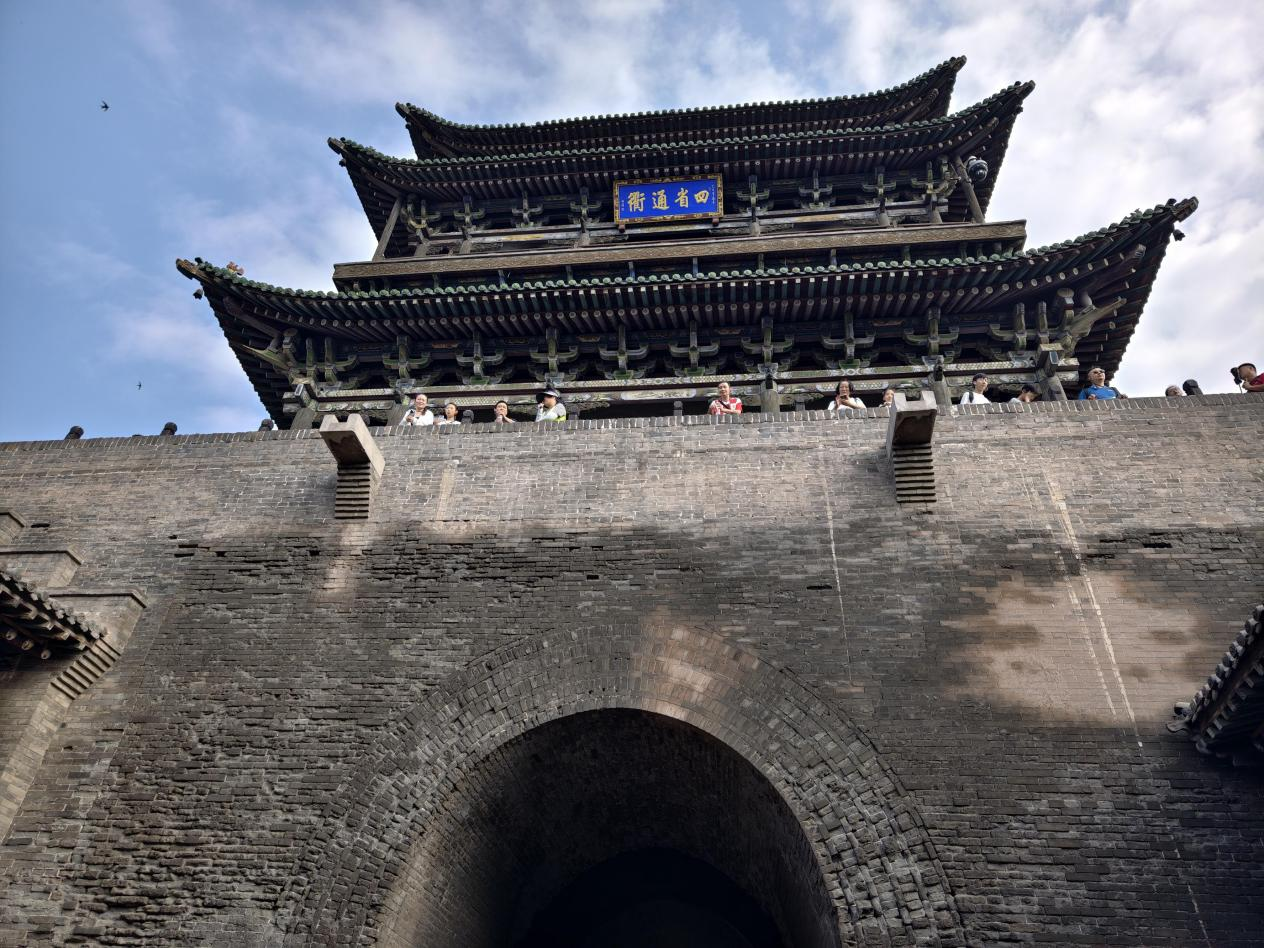 登上古城墻遠(yuǎn)眺,6000多米長(zhǎng)的城墻巍峨挺拔。據(jù)工作人員介紹,現(xiàn)在我們看到的城墻基本上保留了明代的建筑形制,外墻包磚內(nèi)墻夯土。古城內(nèi)以南大街為軸線,四大街、八小巷、七十二條蚰蜒巷縱橫交錯(cuò),民居、客棧、票號(hào)、鏢局等呈東西對(duì)稱分布。青磚路面以及上面深深的古車轍印,是古城“四省通衢”的重要見證。