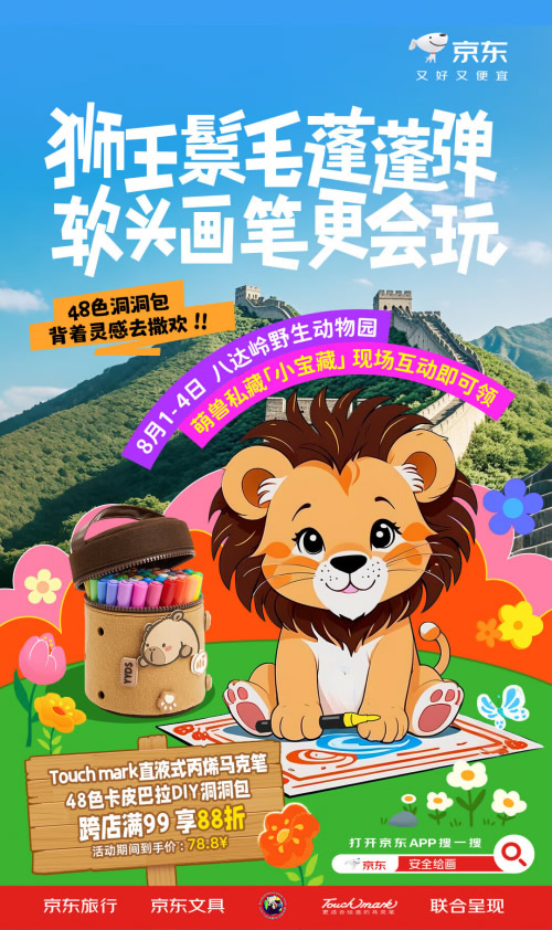 如今暑假期間帶孩子打卡動物園和大自然互動成為了出游的首選,作為中國最大的山地野生動物園,北京八達嶺野生動物園匯集了世界各地的眾多代表性動物,非常適合激發(fā)孩子的創(chuàng)作靈感,在運用中掌握繪畫技能。在8月2日至3日,京東攜手八達嶺野生動物園帶來“猛獸開路 人類穩(wěn)住”文具快閃活動,活動期間京東將安排特色籠車在園區(qū)游覽,為親子游客帶來有趣有料的繪畫體驗,游客完成互動集章還能領取精美禮包,F(xiàn)場,京東文具攜手青竹畫材、Touchmark、輝柏嘉等知名品牌設置了產(chǎn)品展示區(qū),游客可上手品鑒京東甄選的安全無毒繪畫文具,掃碼下單還能享受豐厚優(yōu)惠,福利多多。想要和孩子體驗一場別開生面的繪畫創(chuàng)作,那就記得鎖定京東的這次快閃活動。同時,京東還打造“寶藏文具周”線上會場,為消費者帶來寶藏文具推薦,搜索“安全繪畫”一鍵直達暑假寶藏文具周·靈感周會場,安全無毒隨意畫,親膚水洗真放心。