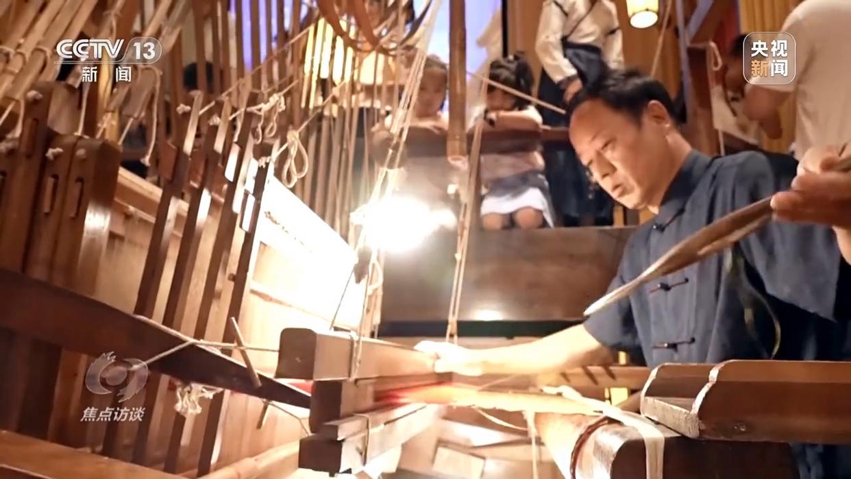 蜀錦省級(jí)非遺傳承人 曹代武:梭子從這個(gè)開(kāi)口里邊過(guò)來(lái),然后我就把緯線編織到里面了,織出來(lái)就是你現(xiàn)在看到的這個(gè)唐代的五彩鳥(niǎo)紋樣。再來(lái)一梭,一梭一梭的,就這樣反反復(fù)復(fù)。