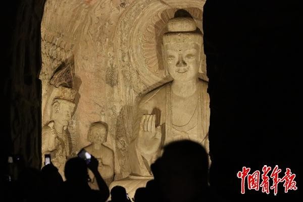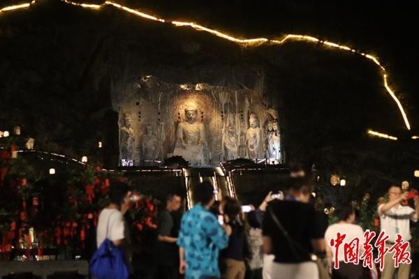 8月19日,河南洛陽,游客在夜色中參觀龍門石窟的賓陽洞。中青報(bào)·中青網(wǎng)記者 余冰玥/攝