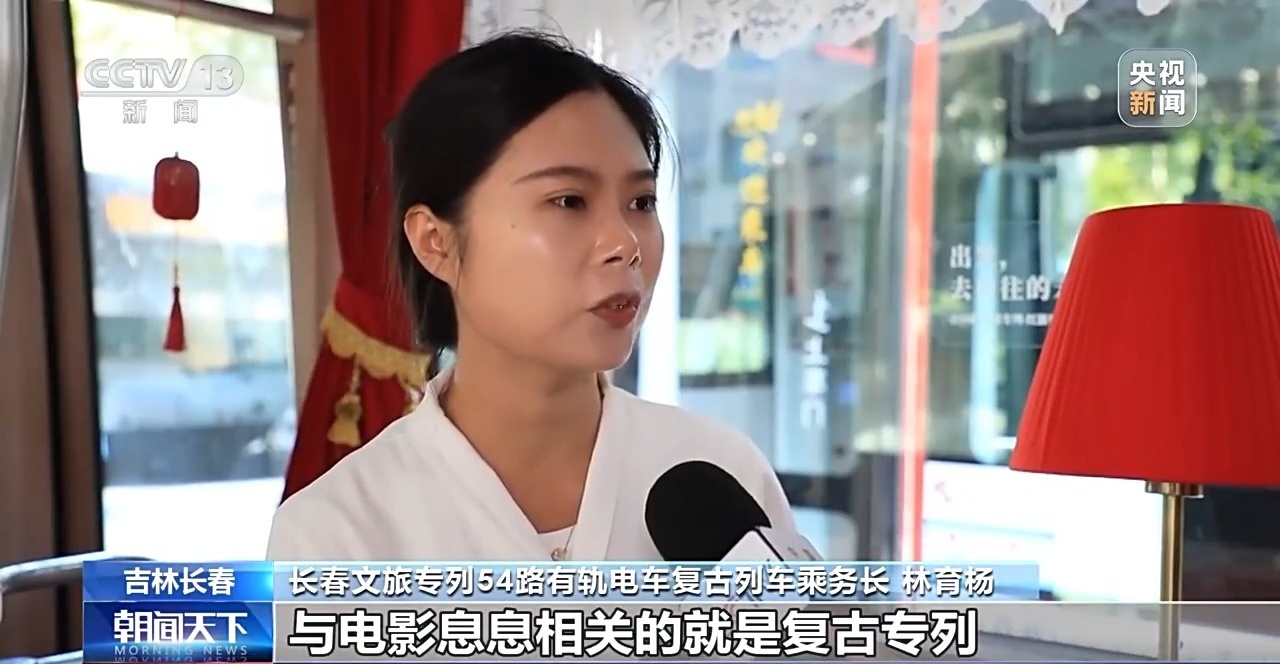 長(zhǎng)春文旅專列54路有軌電車(chē)復(fù)古列車(chē)乘務(wù)長(zhǎng) 林育楊:與電影息息相關(guān)的就是復(fù)古專列。它的起始站就是長(zhǎng)影舊址博物館,途經(jīng)東風(fēng)大街、創(chuàng)業(yè)大街、南陽(yáng)路,都是熱播劇的取景地。