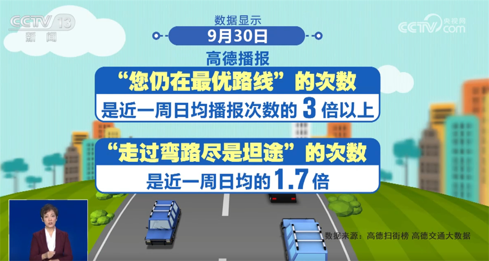 我們再來看一個有趣的數(shù)據(jù)。“雖然前方擁堵,但您仍在最優(yōu)路線上”“今天走過了所有彎路,從此人生盡是坦途”,高德導(dǎo)航的“勸堵”金句與長假出行實(shí)時相伴。數(shù)據(jù)顯示,9月30日,高德播報“您仍在最優(yōu)路線”的次數(shù)是近一周日均播報次數(shù)的3倍以上,播報“走過彎路盡是坦途”的次數(shù)是近一周日均的1.7倍,可見自駕出行的人越來越多。不過,也有重慶網(wǎng)友表示“扎心”,“走過彎路還是彎路,坦途這句等我開出重慶再說。”