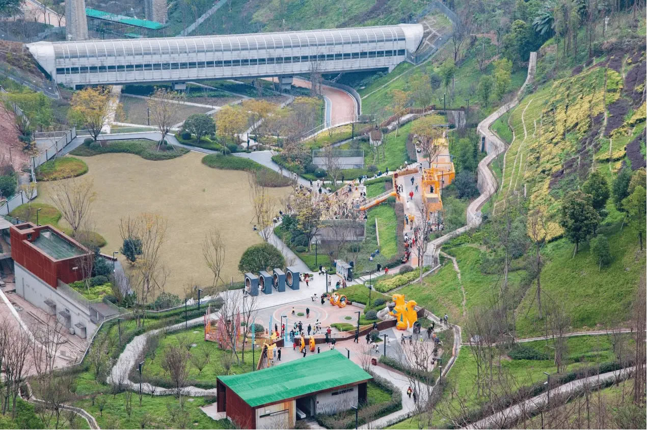 依山就勢(shì),渝中區(qū)推進(jìn)21萬(wàn)平方米坡坎崖由“禿斑”變“綠毯”、由“荒地”變“游園”、由“治理點(diǎn)”變“打卡點(diǎn)”。實(shí)現(xiàn)了鵝嶺—虎頭巖10.8公里山脊線綠蔭如蓋,長(zhǎng)江、嘉陵江11.5公里濱水綠帶織綠成廊。渝中在紅巖公園充分利用“漏斗”地形,擋墻加固崖壁緩坡,生態(tài)復(fù)綠4.35萬(wàn)平方米,中間平坦區(qū)域開(kāi)辟為兒童樂(lè)園,入選全國(guó)兒童友好空間典型案例。