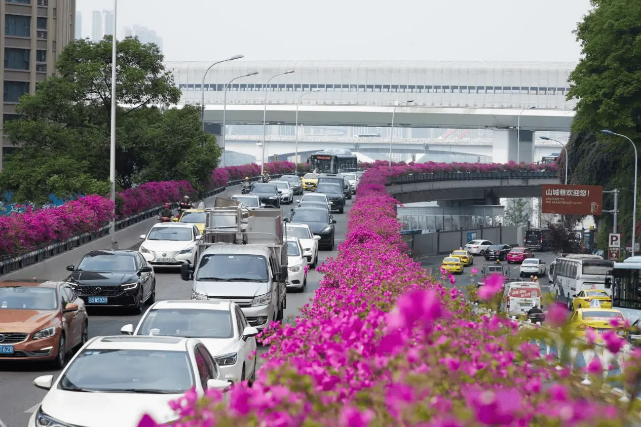 依托密集的立體交通網(wǎng)絡(luò),渝中區(qū)聚焦立交高架、人行天橋、軌道墩柱,打造四季有綠、全年可觀的路上風(fēng)景線,賦予城市交通色彩與活力。渝中區(qū)充分利用中興路高架橋兩側(cè)空間,通過(guò)鋼結(jié)構(gòu)支撐,加掛耐修剪、易養(yǎng)護(hù)的三角梅花箱,形成500米空中花廊。