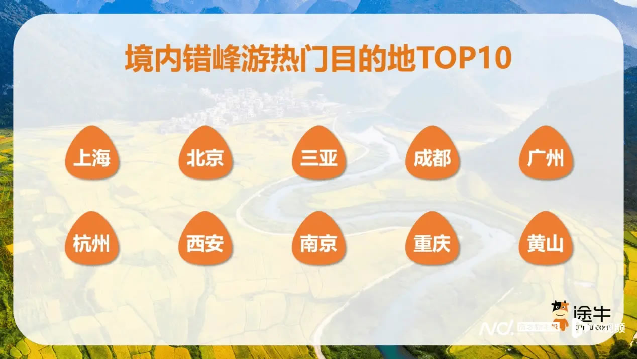 境內(nèi)錯(cuò)峰游仍是多數(shù)游客的首選,途牛平臺(tái)上境內(nèi)出游人次占比超過(guò)70%。熱門(mén)目的地包括上海、北京、三亞、成都、廣州、杭州、西安、南京、重慶、黃山等地。