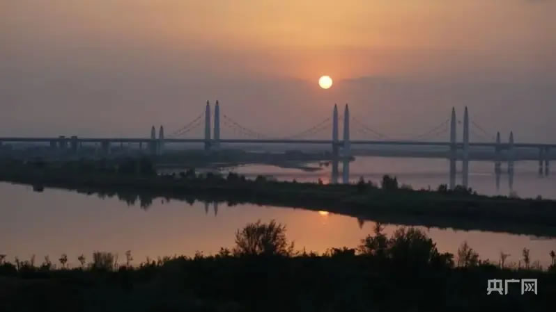 黃河濕地公園畔,落日與長(zhǎng)橋在水面繪就絕美畫卷(央廣網(wǎng)發(fā) 楊佳 攝)