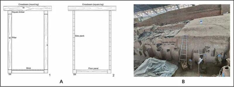 陪葬坑過洞主要木質(zhì)框架結(jié)構(gòu)示意圖(A1:兵馬俑坑;A2:K9901及K9801)及兵馬俑一號(hào)坑內(nèi)炭化木質(zhì)建筑結(jié)構(gòu)。秦始皇帝陵博物院供圖