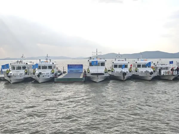 本次演練以“實(shí)戰(zhàn)導(dǎo)向、效果為先”為原則,模擬船舶碰撞、人員落水等極端場景,共分為旅游船舶開航前自查、旅游船舶環(huán)太湖聯(lián)動動態(tài)監(jiān)測、極端天氣旅游船舶應(yīng)對處置、旅游船舶險(xiǎn)情處置、人員落水應(yīng)急處置5個科目。其中,旅游船舶開航前自查科目中,對照《中國籍船舶開航前自查清單》嚴(yán)格開展自查工作,確保船舶適航、人員適配,保證航行安全。環(huán)太湖旅游船舶聯(lián)動動態(tài)監(jiān)測科目驗(yàn)證了現(xiàn)有監(jiān)控系統(tǒng)對湖區(qū)船舶的精準(zhǔn)感知與實(shí)時(shí)管控能力,檢驗(yàn)了跨區(qū)域多部門協(xié)同響應(yīng)機(jī)制的可行性與高效性。極端天氣旅游船舶應(yīng)對處置科目模擬旅游船舶航行途中遭遇極端天氣,“蘇交執(zhí)法錫039”輪、“湖州執(zhí)法艇浙交巡0328”輪迅速進(jìn)入伴航狀態(tài),與游船配合形成“兩艇護(hù)一船”的防護(hù)陣形,全程護(hù)航,實(shí)時(shí)監(jiān)測周邊水域動態(tài)、規(guī)避潛在風(fēng)險(xiǎn),主動提供必要的航行協(xié)助。旅游船舶險(xiǎn)情處置科目充分展示旅游船舶在航行過程中突發(fā)極端天氣的全過程應(yīng)對處置,包括預(yù)警接收、封航、應(yīng)急避險(xiǎn)、協(xié)同數(shù)援、人員轉(zhuǎn)運(yùn)。人員落水應(yīng)急處置科目中,應(yīng)用無人機(jī)、遙控救生機(jī)器人新型智能裝備與數(shù)字化技術(shù),為最大限度挽救生命提供堅(jiān)實(shí)保障。