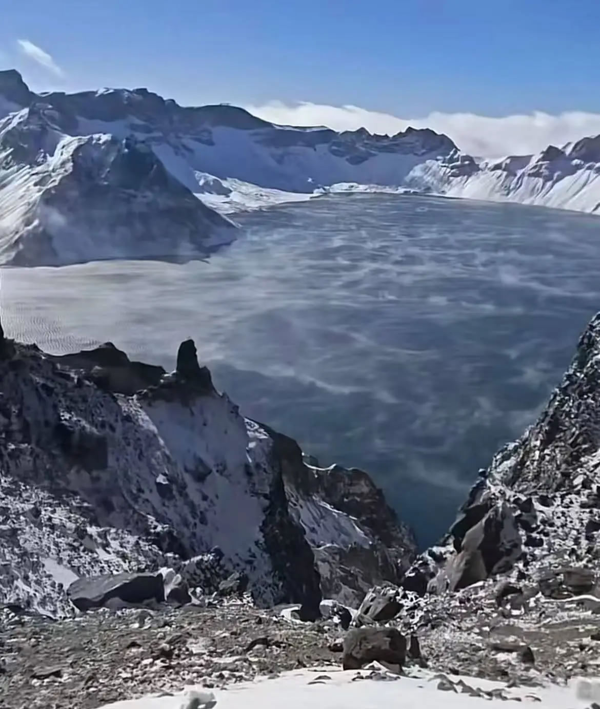 長白山景區(qū)的一位導游晚晚(化名)當天也目睹了“海浩”的奇觀。10月20日上午9點左右,她跟隨景區(qū)工作人員前往天池附近清理道路積雪,來到北坡一觀景臺處時,看到在大風吹拂下,凝結的水蒸氣正貼著天池的水面擴散、飄動。