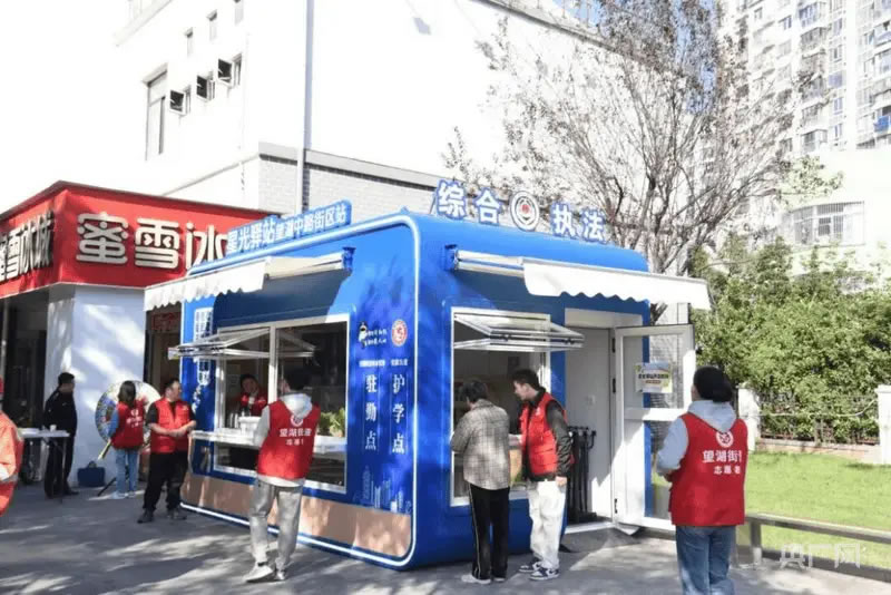 作為街區(qū)重要的“便民樞紐”,星光驛站功能定位清晰明確:面向戶外勞動(dòng)者,這里是一座“能量補(bǔ)給站”,免費(fèi)提供飲水、熱飯、充電等基礎(chǔ)服務(wù),驅(qū)散奔忙的疲憊;對(duì)于周邊居民,它是一處“暖心港灣”,常態(tài)化開(kāi)展義診、義剪等志愿服務(wù),讓便利直達(dá)身邊;針對(duì)沿街商戶,驛站則是一個(gè)“助力平臺(tái)”,及時(shí)更新政策手冊(cè)、提供證照辦理咨詢,助力經(jīng)營(yíng)發(fā)展。