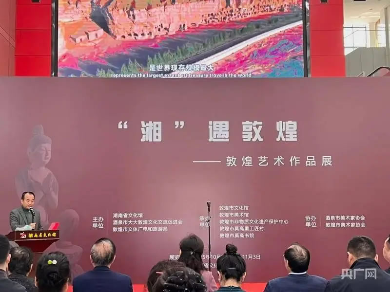 央廣網長沙10月28日消息(記者 黃珂嵐 實習記者 蔣好)10月28日上午,一場跨越千山萬水、連接千年文明的文化盛宴“湘”遇敦煌——敦煌藝術作品展,在湖南省文化館盛大開幕。此次展覽不僅是敦煌文化與湖湘文化的一次深度對話,更為兩地文化交流互鑒構建新橋梁。據(jù)悉,展覽將持續(xù)至11月3日結束。
