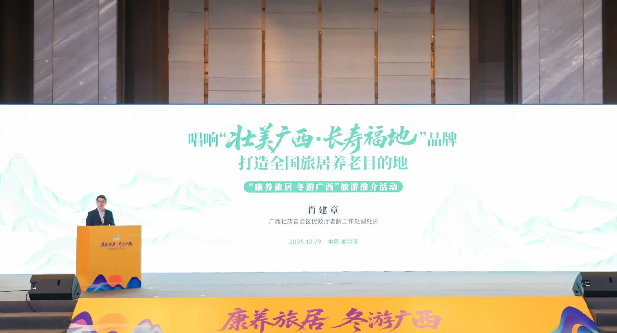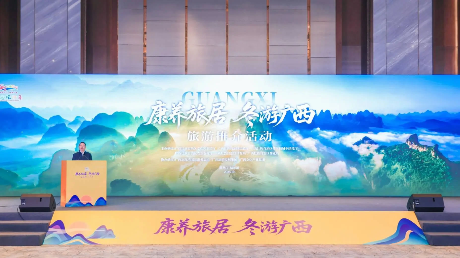 10月28日-29日,由廣西壯族自治區(qū)文化和旅游廳、民政廳、住房城鄉(xiāng)建設廳、農業(yè)農村廳、體育局、林業(yè)局共同主辦的“康養(yǎng)旅居 冬游廣西”旅游推介活動在哈爾濱市舉辦。