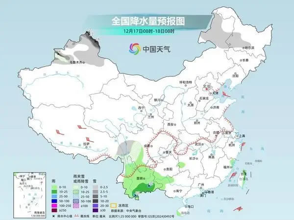 明天,內(nèi)蒙古東北部、黑龍江西南部、新疆北部、川西高原南部等地部分地區(qū)有小到中雪或雨夾雪,其中,新疆阿勒泰地區(qū)和伊犁河谷局地有大到暴雪。西南地區(qū)南部、湖南西部、福建東北部、廣西西北部、海南島西南部等地部分地區(qū)有小到中雨,其中,云南東南部局地有大雨。