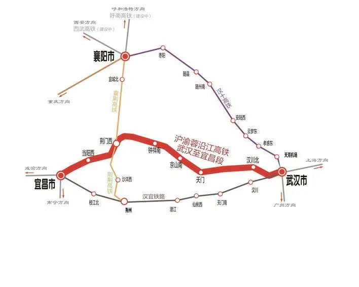 滬渝蓉高鐵武宜段位于湖北省境內(nèi),起自武漢市,經(jīng)天門市、荊門市,終至宜昌市。線路正線全長314公里,設(shè)計(jì)時(shí)速350公里。開通后,宜昌至武漢的鐵路旅行時(shí)間將從目前的2小時(shí)大幅壓縮至最快1小時(shí)09分。