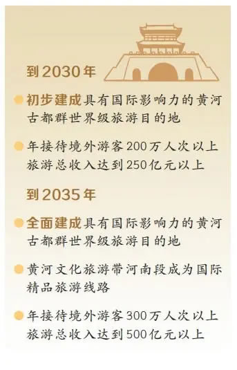 《規(guī)劃》設(shè)定的雙階段目標(biāo),為黃河古都群的發(fā)展錨定了清晰航向。到2030年,初步建成具有國際影響力的黃河古都群世界級旅游目的地,年接待境外游客200萬人次以上,旅游總收入達到250億元以上;到2035年,全面建成具有國際影響力的黃河古都群世界級旅游目的地,黃河文化旅游帶河南段成為國際精品旅游線路,年接待境外游客300萬人次以上,旅游總收入達到500億元以上。