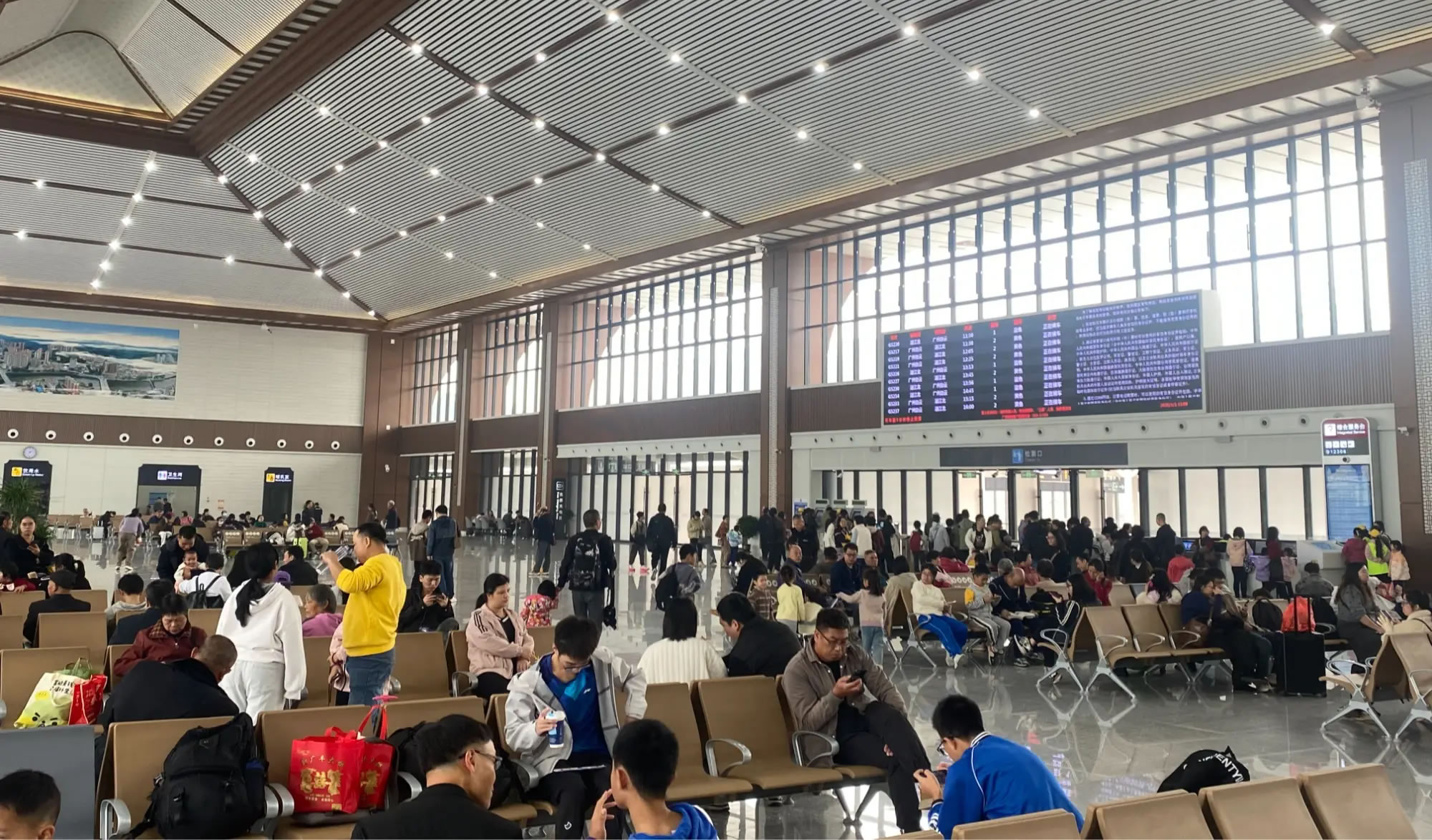 上午的候車大廳內(nèi),客流較平日明顯增多。旅客在志愿者和工作人員的引導(dǎo)下有序候車,安檢口雖排起隊(duì)伍,但通行速度較快,廣播循環(huán)播放著安全提示和車次信息,整體氛圍忙而不亂。