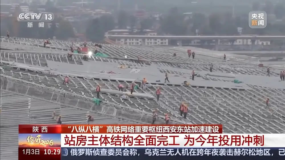 總臺(tái)記者 甘軻晗:在西安市灞橋區(qū)的西安東站建設(shè)現(xiàn)場(chǎng),目前工程已轉(zhuǎn)入金屬屋面玻璃天窗安裝、幕墻立面龍骨安裝和內(nèi)部裝飾裝修階段。盡管還處于元旦假期,站房建設(shè)依然在全速推進(jìn)。工作人員告訴我,今天現(xiàn)場(chǎng)仍有2000多名建設(shè)者堅(jiān)守施工一線,為今年西安東站的正式投用發(fā)起沖刺。